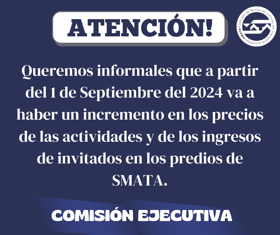 ATENCIÓN! Queremos informarles que a partir del 1 de Septiembre del 2024 va a haber un incremento en los precios de las actividades y delos ingresos de invitados en los predios de S.M.A.T.A.